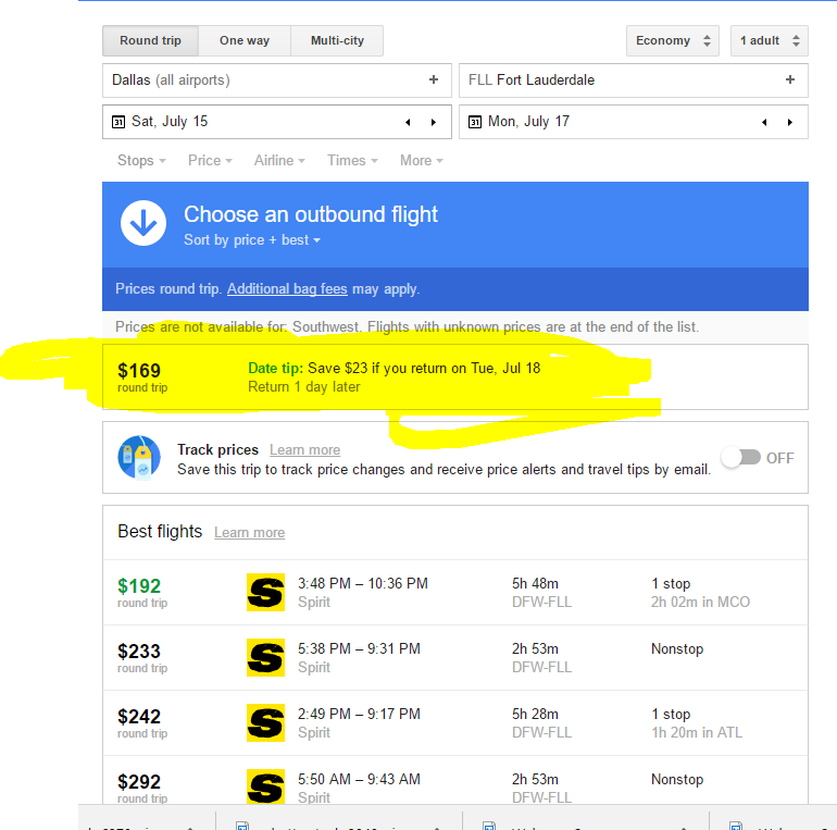 Google Flights will track flight prices for you in addition to sending you alerts when prices drop or rise. It also shows use the lowest price for any day on the calendar to your destination. Don't forget to pay attention to the tip bar, which tells you how much money you'll save if you choose a different airport, fly later or earlier in the day. You can also track flights, and receive phone or email notifications when prices rise or drop. I also love that Google Flights includes Southwest. Many sites don't include their fares.
